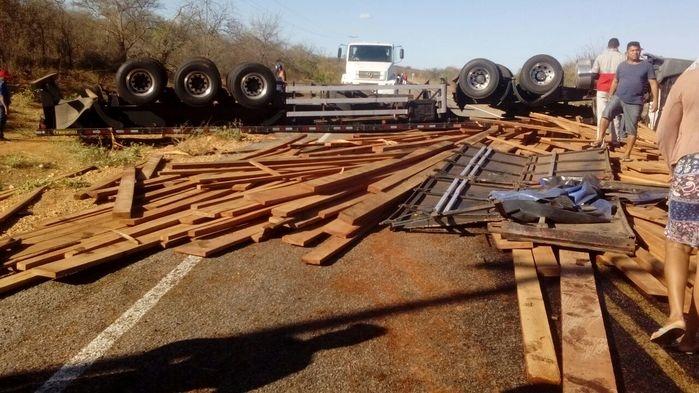 Uma carreta que transportava madeira tombou no final da tarde de quarta-feira (9) na PI 143, no trecho entre as cidades de Jacobina do Piauí e Conceição do Canindé.